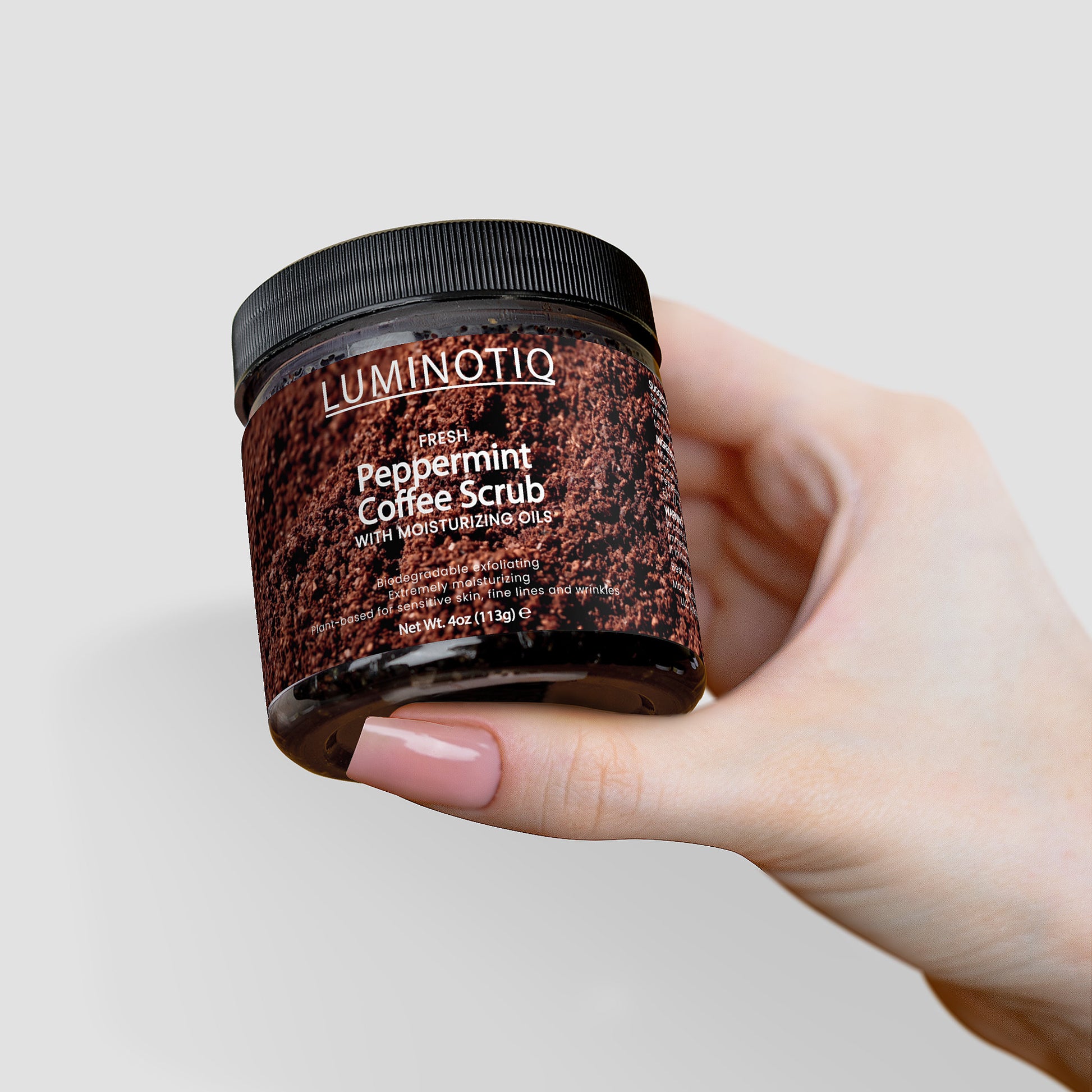 - Enjoy the invigorating scent of Peppermint and Dark Roast coffee as you indulge in your skincare routine.